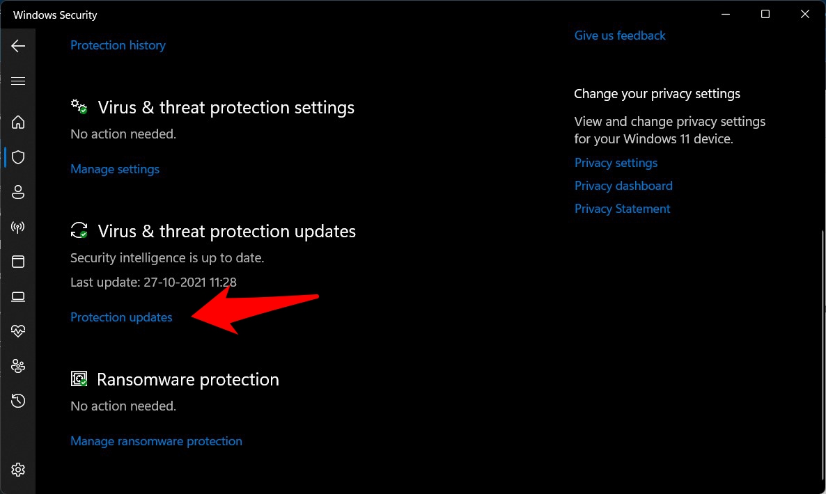 - 之后,滚动到病毒和威胁防护更新,然后单击防护更新。