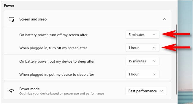 在电源和电池选项中,如果“屏幕和睡眠”部分关闭,请单击展开它。菜单将显示几个选项。如果您有电池供电的便携式 PC 或平板电脑,您会看到其中四个。如果您有台式 PC,则只会看到两个选项。