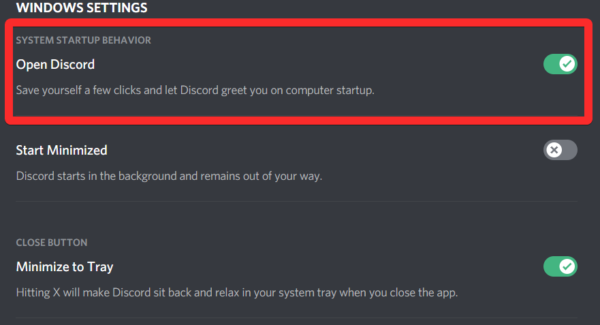 如他们的支持页面所述,防止 Discord 在启动时启动的最简单方法是通过应用程序本身。