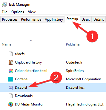 现在单击并选择屏幕顶部的“启动”选项卡。您现在将看到系统中已启用自动启动的应用程序列表。在此列表中找到并取消选中 Discord 旁边的框。