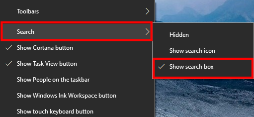 要将其放在任务栏上,请右键单击任务栏,将鼠标悬停在Search 上,然后单击 Show Search Box。