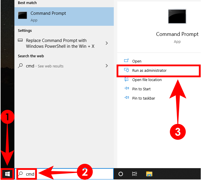但首先,按Start,键入 cmd,然后单击Run as administrator。