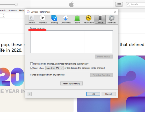 此空间将允许您调整您对 iTunes 应用程序的个人偏好。现在,转到“设备”选项卡,您将在“设备备份”文件夹下看到一个包含 iPhone 备份的窗口。
