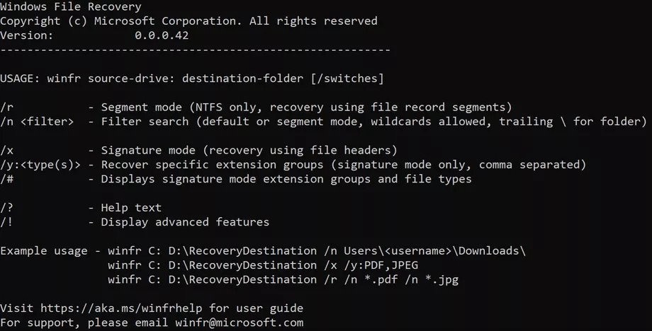 在尝试恢复丢失的文件之前,您应该熟悉不同的推荐模式:默认、分段和签名。根据 Microsoft 的文档,您应该仅使用默认模式来恢复 NTFS 系统上最近删除的文件。