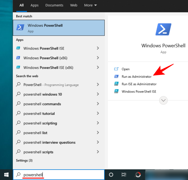 按开始,键入“PowerShell”,然后单击 以管理员身份运行。