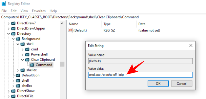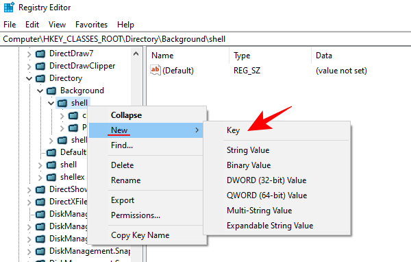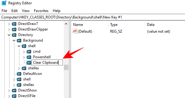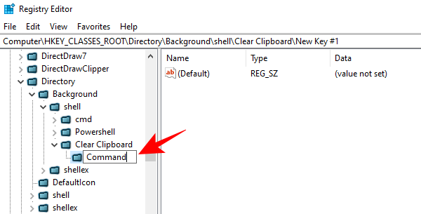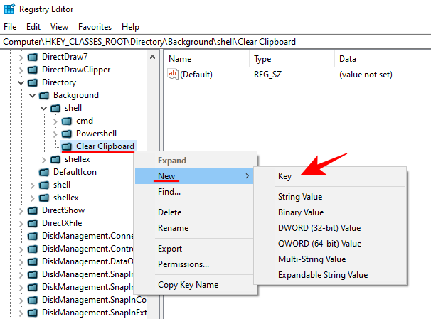 现在,右键单击此 Clear Clipboard 文件夹,选择New,然后 选择Key。