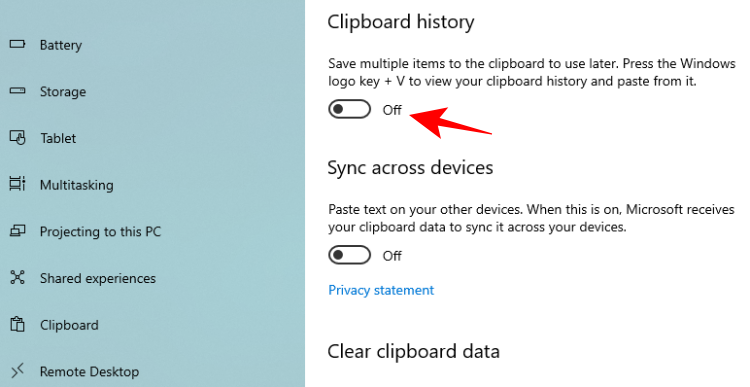 在左窗格中,选择剪贴板。 在右侧,关闭“剪贴板历史记录”按钮。