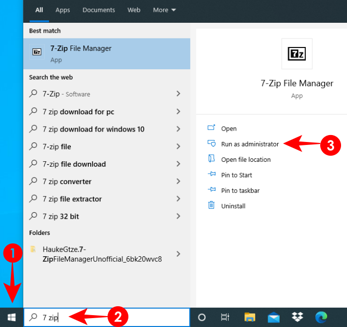 为此,请在管理模式下打开 7zip 文件管理器。按“ 开始”,键入“7zip”,然后选择“以管理员身份运行”。