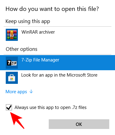 这将调出与前一种方法相同的窗口。找到 7zip 文件管理器并确保选中“始终使用它打开*文件类型* ”框。