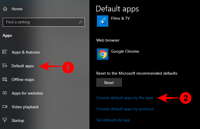 在左侧面板上,单击默认应用程序。然后,在右侧面板上向下滚动并单击 Set defaults by file type。
