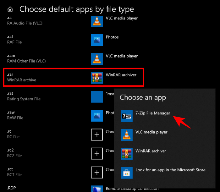 在这里,您可以单独选择默认情况下要使用 7zip 文件管理器打开的文件类型。例如(如下所示),如果您想更改 .rar 文件的默认应用程序,请在左窗格中找到 .rar,然后在右窗格中单击它旁边的应用程序,然后选择 7zip 文件管理器。