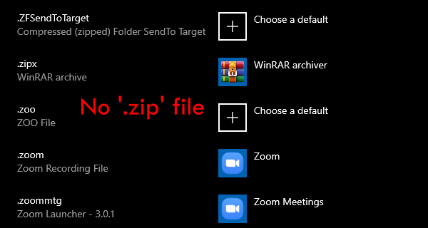 在某些情况下,您可能在列表中找不到要与 7zip 关联的文件类型。在我们的示例中,没有选择 .zip 文件 – 最常见的存档文件之一。