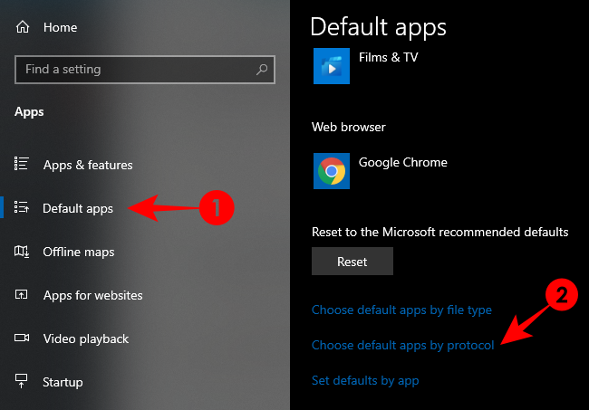 在这些情况下,可能会将同一文件设置为使用 Windows 资源管理器打开。返回默认应用设置窗口,然后选择 按协议选择默认应用。