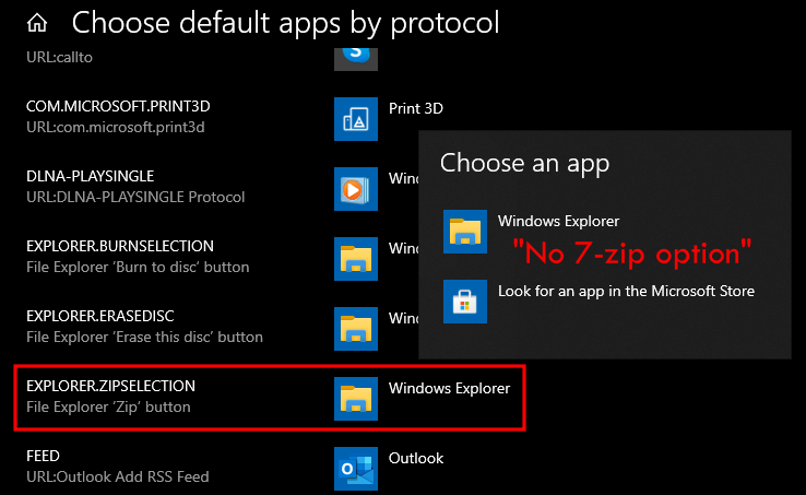 但是不能通过单击此文件并选择 7zip 来简单地更改默认应用程序。您不会在列表中找到 7zip 选项(见上图),也无法“在 Microsoft Store 中查找应用程序”。这是因为 EXPLORER.ZIPSELECTION 不是 7zip 识别的文件。