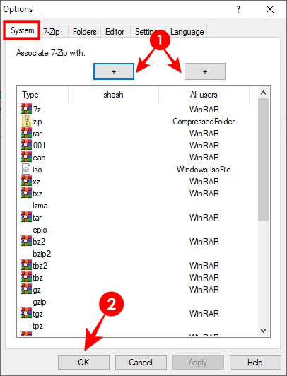确保您位于“系统”选项卡上。在这里,您会发现两个“+”按钮——一个用于将文件关联到当前用户的 7zip,一个用于所有用户。您可以单独选择要在 7zip 中打开的文件类型。或者,您只需单击“+”按钮两次即可在 7zip 中打开它们。单击确定