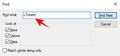 删除出现的文件夹和键。按 F3 查找后续 µTorrent 实例。这样做直到您在注册表中找不到任何 µTorrent 条目。