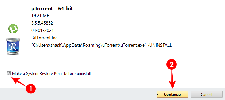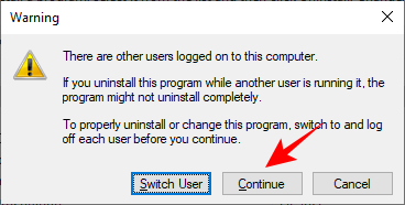 如果其他用户也登录到计算机,您将收到以下消息。只需单击“ 继续”即可卸载 µtorrent。