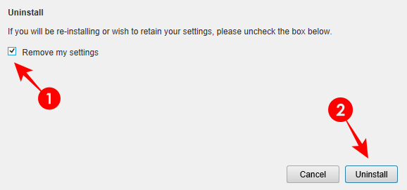这将打开卸载向导。选中“删除我的设置”旁边的框,然后单击“ 卸载”。