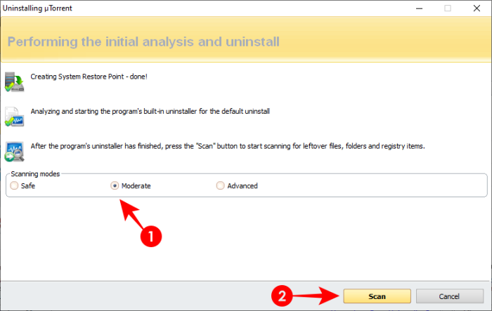 然后,您将获得扫描剩余文件、文件夹和注册表项的选项。您可以在安全、中等或高级模式下进行扫描。选择一个并单击“ 扫描”。