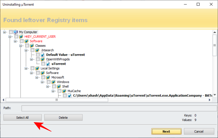 您将在注册表中看到一堆 µTorrent 文件。单击“全选”。