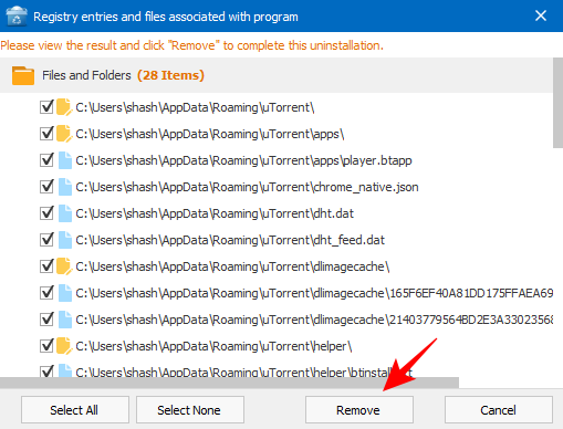 在强制卸载中,您将获得与 Revo 卸载程序类似的选项。默认情况下将选择所有 µTorrent 注册表项。单击“删除”。