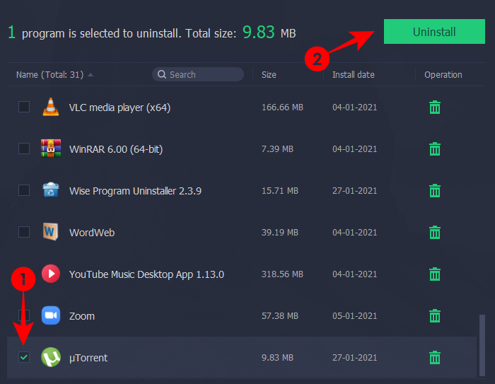 打开 Wise Program Uninstaller,找到并点击 µTorrent。您将获得两个选项 – 安全卸载和强制卸载。