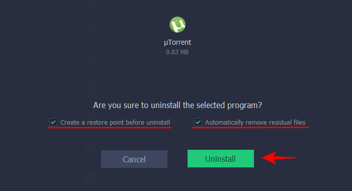 您将获得两个额外的选项可供选择——“卸载前创建还原点”和“自动删除残留文件”。检查它们,然后单击卸载。