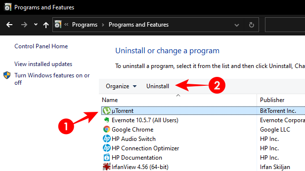 使用控制面板卸载µTorrent