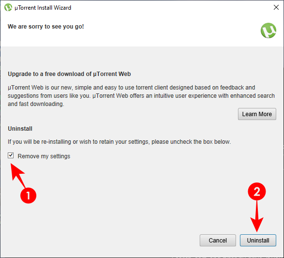 这将调出与先前方法相同的卸载向导。按照之前的步骤卸载 µTorrent。此外,如果您有 µTorrent Web,请以同样的方式卸载它。