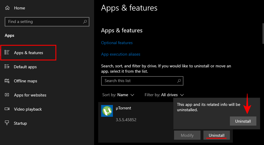确保您位于左侧的应用和功能 设置中。在右侧,点击 µtorrent,然后点击卸载。