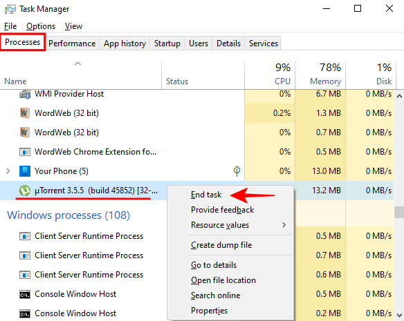在“进程”选项卡下,向下滚动以查找 µTorrent。右键单击它并结束任务。