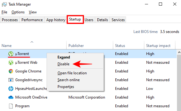 现在转到“ 启动” 选项卡。然后右键单击并在此处禁用 µTorrent 的所有实例。