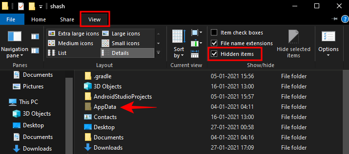 转到 C:\Users\YourUserName。在这里,您必须找到隐藏的 Appdata 文件夹。要访问它,请单击上方工具栏中的“查看”,然后选择“ 隐藏的项目”。这将显示 AppData 文件夹。双击它。