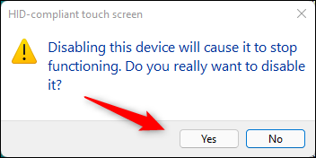 在出现的对话框中,单击“是”以确认您确实要禁用触摸屏。