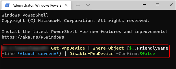 Get-PnpDevice | Where-Object {$_.FriendlyName -like '*touch screen*'} | Disable-PnpDevice -Confirm:$false