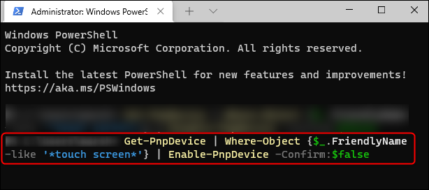 Get-PnpDevice | Where-Object {$_.FriendlyName -like '*touch screen*'} | Enable-PnpDevice -Confirm:$false