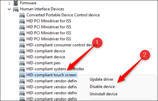 在出现的列表中,找到 HID-Compliant Touch Screen。右键单击它,然后从上下文菜单中选择“禁用设备”。