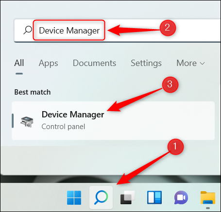 您可以使用设备管理器在 Windows 11 上禁用触摸屏。首先,单击任务栏中的 Windows 搜索图标,在搜索栏中键入“设备管理器”,然后从搜索结果中单击“设备管理器”。