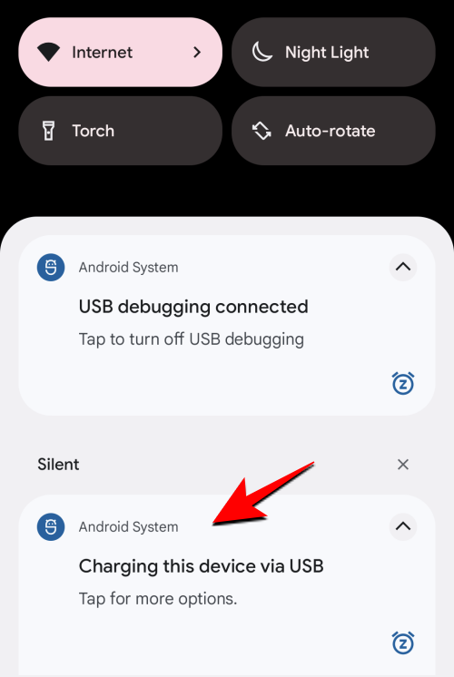 现在,通过 USB 电缆将您的智能手机连接到您的 PC。在您的设备上向下滑动,然后点击通过 USB 为该设备充电以显示更多选项。