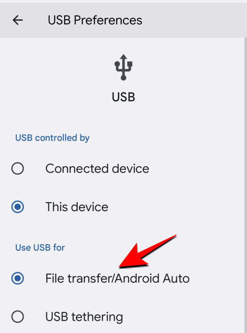 然后点击文件传输。这将允许您的 PC 访问您手机的存储空间。