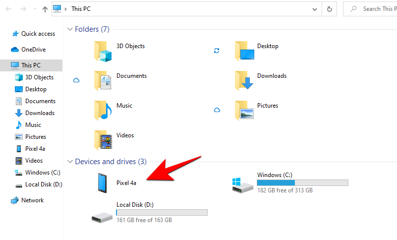 您的 Android 设备的存储文件夹应该会自动在您的 PC 上打开。如果没有,请打开文件资源管理器 (Win+E) 并在“此 PC”部分中选择您的设备。