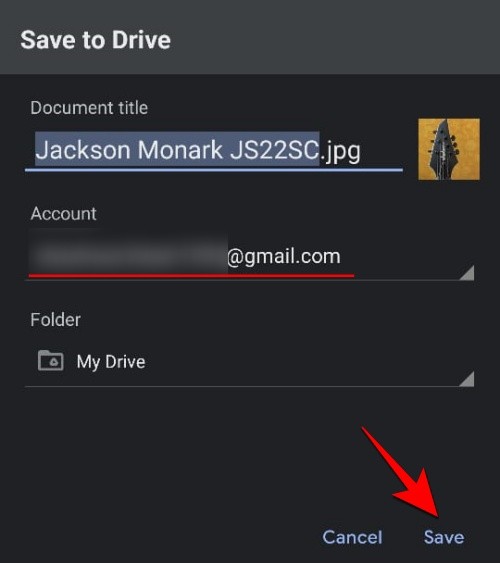 在下一个屏幕上,您将获得重命名标题、更改 Google 云端硬盘帐户以及在云端硬盘中选择要保存它的文件夹位置的选项。但是,由于您稍后将在 PC 上下载文件,因此不需要它。只需记下所选的 Google 帐户(如果您有多个)。然后点击保存。