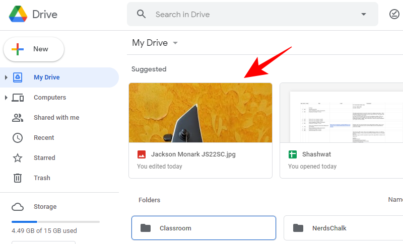 现在,在您的 PC 浏览器上访问drive.google.com,并确保您选择了之前保存文件的相同 Google Drive 帐户。您照片的缩略图将显示在您的云端硬盘主页上。