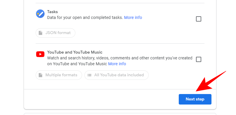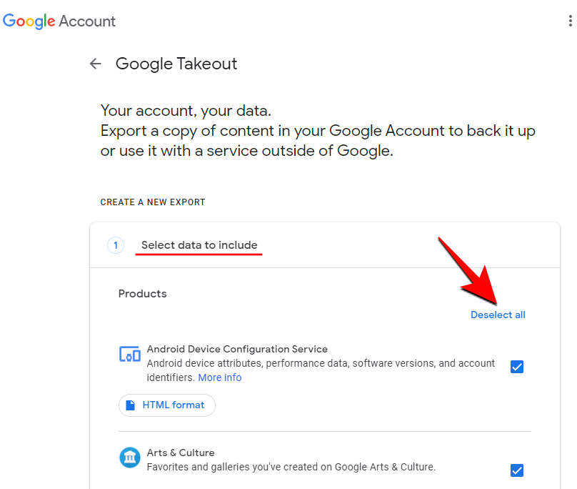 转到takeout.google.com并确保您已登录 Google 帐户。然后,第一步,单击“选择要包含的数据”下的“取消全选”。