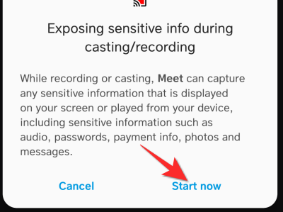 您的手机会显示一条免责声明,表示您的手机现在将被录音。点击立即 开始以开始共享屏幕。