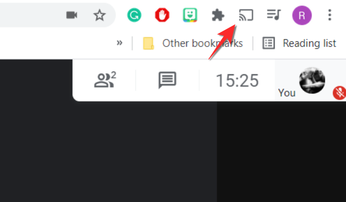 扩展程序准备就绪后,您可以单击投射图标以在 Google Meet 中共享音频。它将确定需要在会议中投射哪个链接并将其直接呈现给所有其他参与者。
