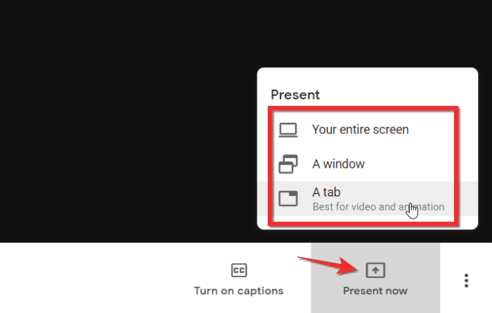 还有另一种在 Google Meet 上共享音频的方法。这个是专门用于共享 Chrome 标签的,对于以完美的清晰度共享清晰的 YouTube 音频非常有用。