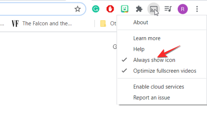 一旦投射图标出现在您的扩展队列中,右键单击该图标,然后单击始终显示图标 以保持投射图标可见。