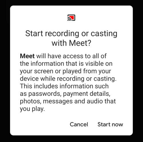 就像在桌面上一样,您也可以通过手机在 Google Meet 上共享屏幕。虽然在 iOS 或 Android 上的“设置”应用程序中没有授予额外的权限,但在您点击“共享屏幕”后,系统会立即提示您访问您的屏幕。这个提示在 Android 上看起来像这样,而 iOS 用户会收到一个类似的弹出窗口,要求用户开始广播他们的屏幕。