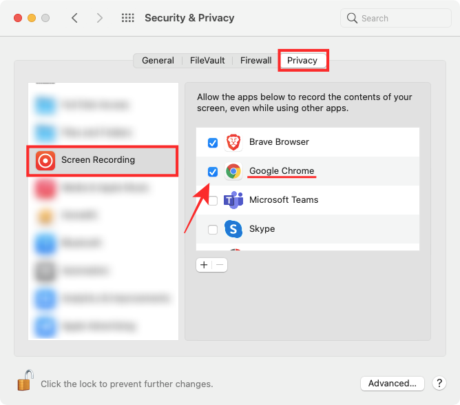 选中要启用屏幕共享的浏览器应用程序旁边的框。执行此操作后,退出浏览器并再次启动它。